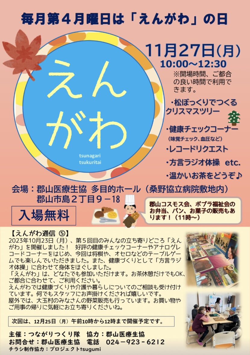 2023年6月から郡山医療生協多目的ホール(桑野協立病院敷地内)にて、みんなの立ち寄りどころ「えんがわ」開いて […]