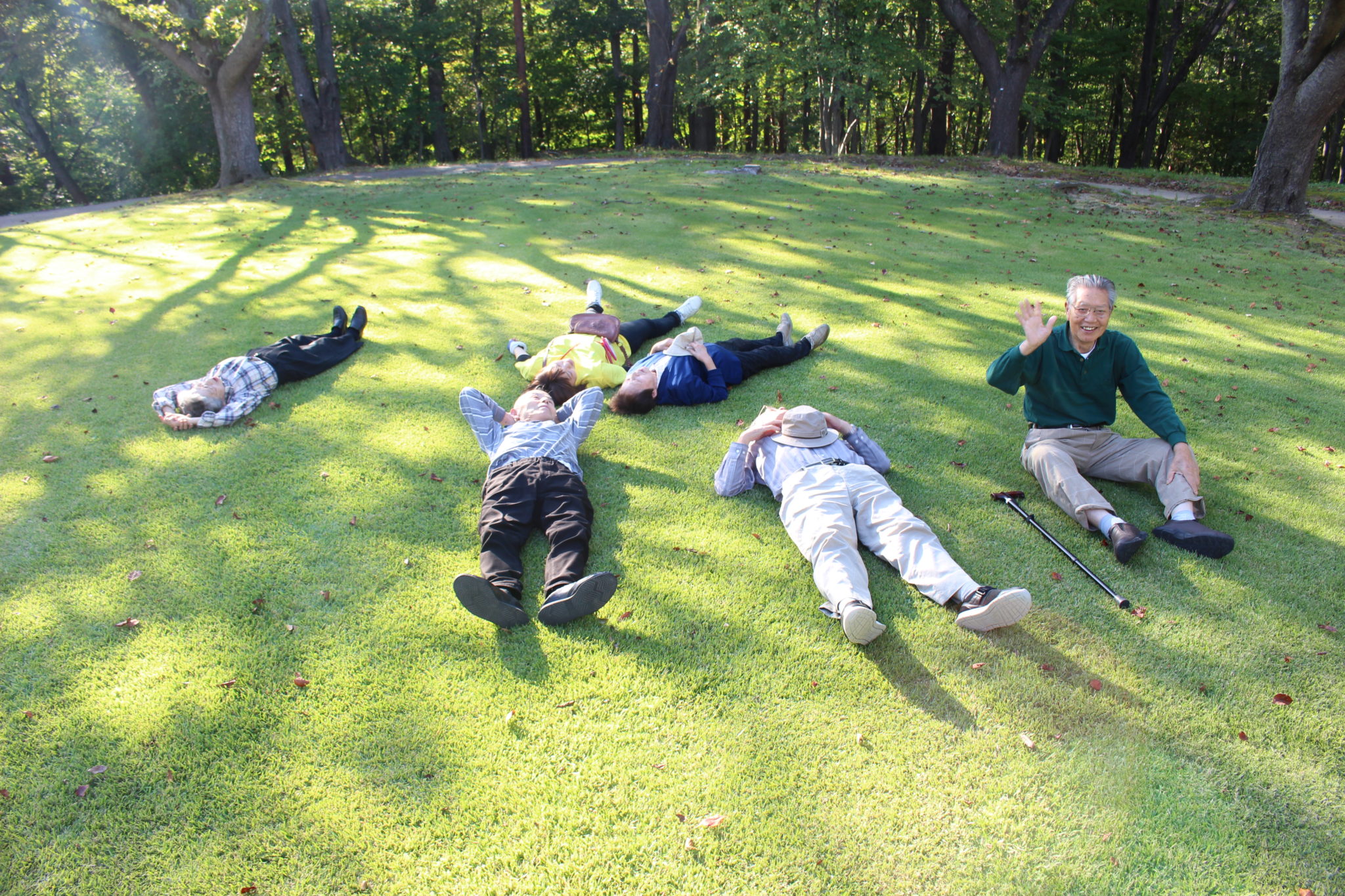 外出の日。公園の芝生に寝そべってみました。(デイサービスセンターポエム郡山賀庄)