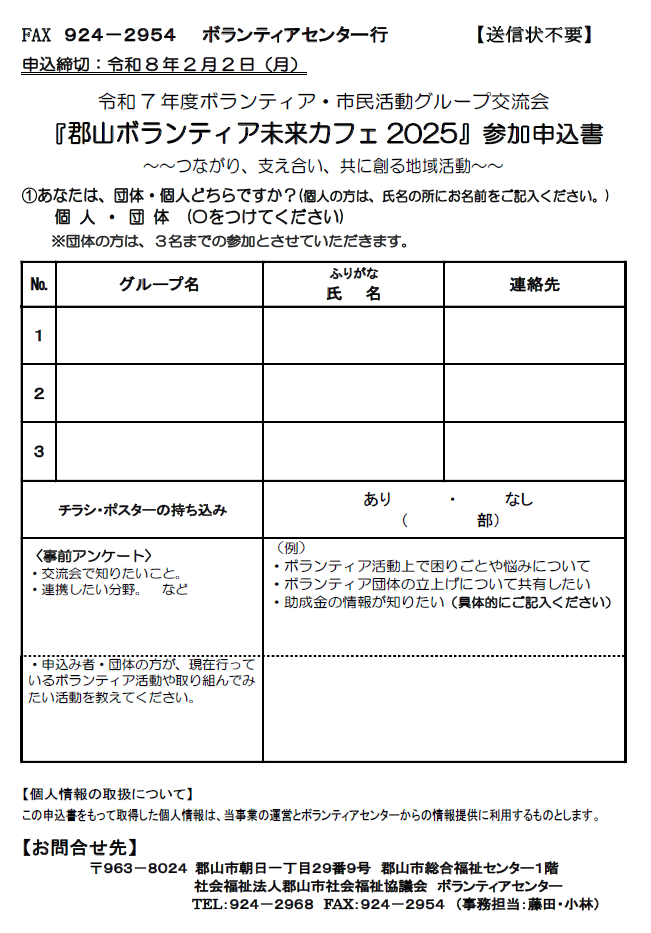 ご不明な点は、郡山市社会福祉協議会ボランティアセンターまでご連絡いただけます