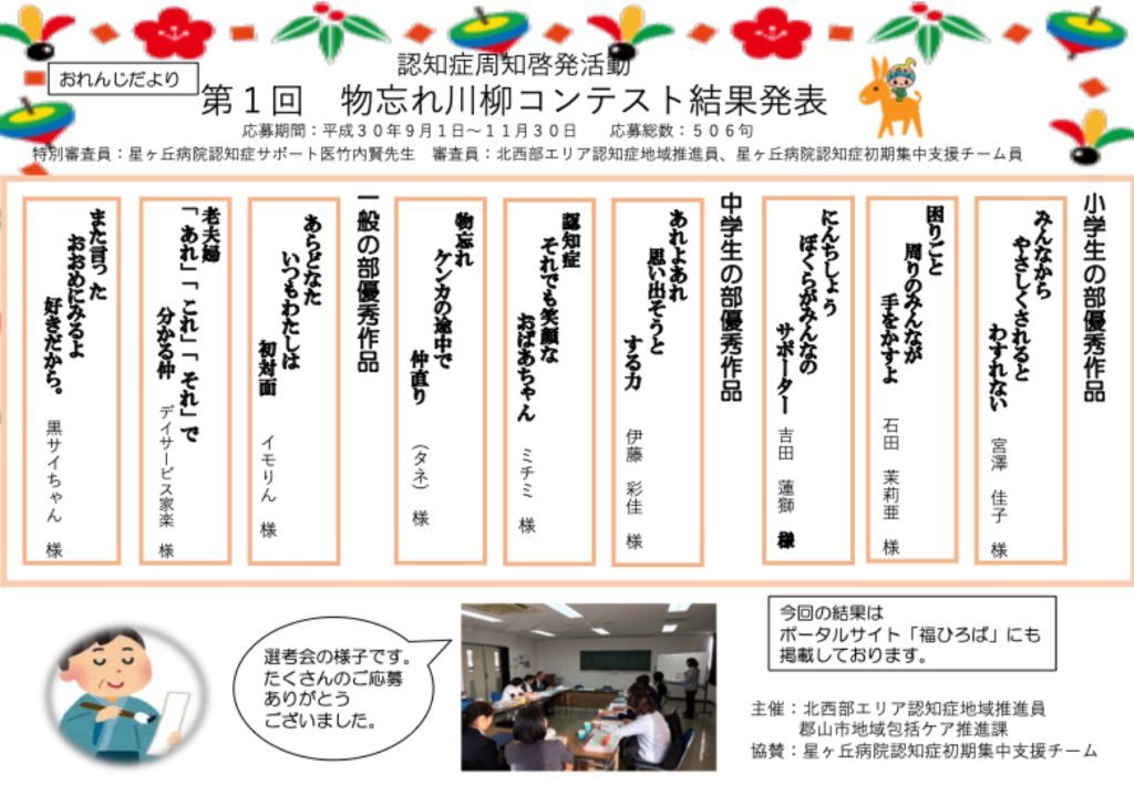 2019/02/13 物忘れ川柳の選考結果発表!! 認知症周知啓発活動 第1回 物忘れ川柳コンテスト結果発表!! 北西部エリア認知症地域推進員と郡山市地域包括ケア推進課が主催した「物忘れ川柳コンテスト」の結果が出ました! 平成30年9月1日から11月30日までの期間で募集をしまして、この福ひろばでもご案内させていただきました。 応募総数506句の中から選ばれた9句をご紹介させていただきます( ^∀^)