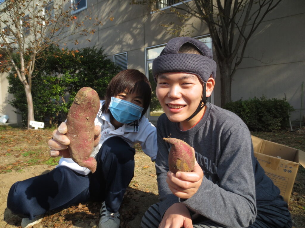 園芸活動で育てたさつまいもの収穫です。今年は少し小さめでしたが、このあとは焼き芋にしてみんなで食べました。甘くておいしかったです。