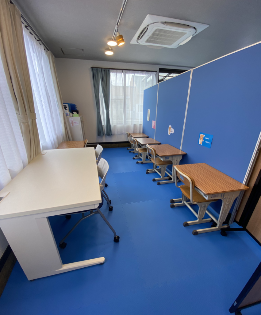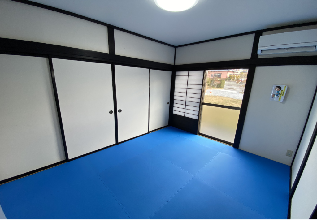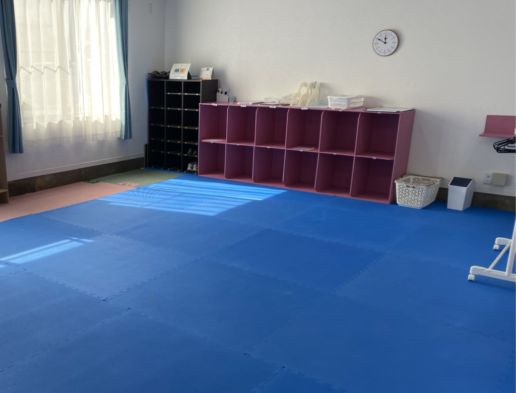 運動療育室は、療育中にお子様の集中が続くよう出来るだけシンプルな物の配置にしています。床にはジョイントマットを敷き、安心して運動できるように環境を調整しています。
