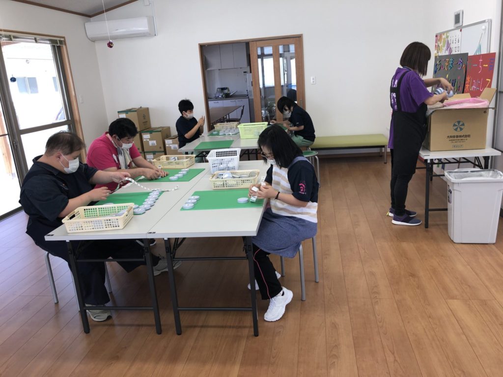 主として各種容器やビンのふたなどにラベル張りなどの軽微な作業をしています。