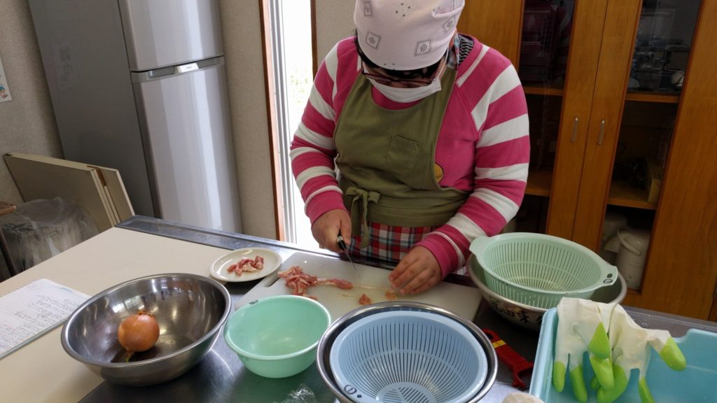 週に一度、利用者さんと共に昼食づくりを行っています。事業所で経験したことを家庭に繋げていけるように考えています。調理以外にも、米研ぎや洗い物も体験しています。