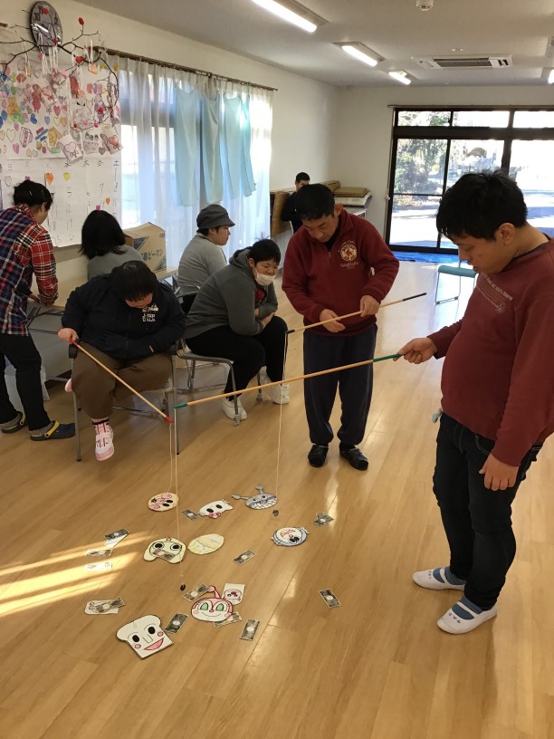余暇班の様子です。主に午前中に曜日ごとに内容を変えて活動をしています。この日は、ミニゲームで魚釣りゲームを楽しそうに行っていました。