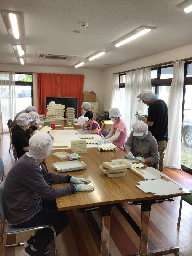 作業班の様子です。主に午前中に生産活動を行っています。菓子箱折りと海苔屋の箱折りの2種類ある中、この日は菓子箱折りで、それぞれ出来る工程を頑張って取り組んでいます。