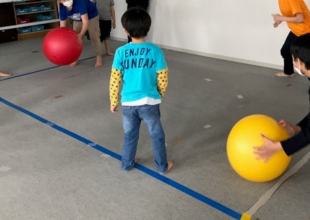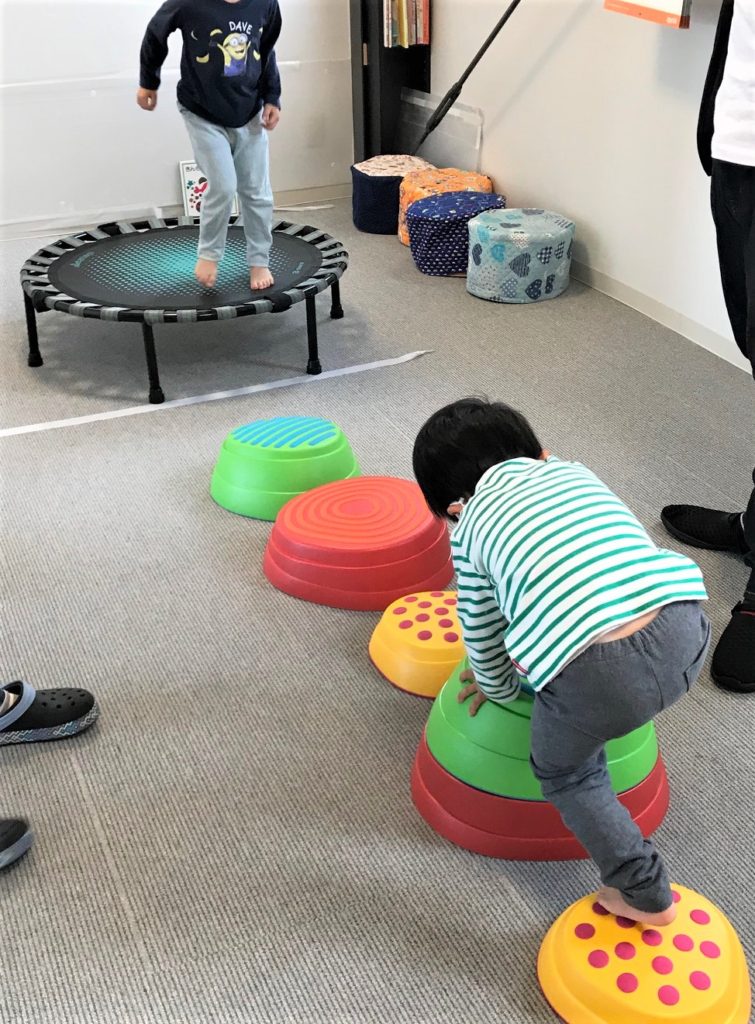 児童発達支援で運動遊びを行っているところです。トランポリン(大、小)や平均台、バランスボール、パカポコ、ラバーリング、シーツブランコ等、遊びの中で楽しみながら体力作りや体幹作りをしています。集団活動を通して、お友達とのコミュニケーションや社会性を育めるよう支援しています。