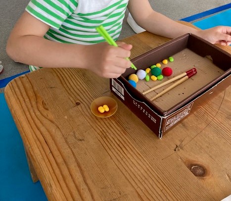 放課後等デイサービスの個別課題で箸練習を行っているところです。その他蝶々結びやペグ刺しなど手先を使ったものや日常生活に役に立つ訓練を行っています。