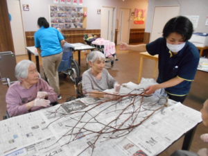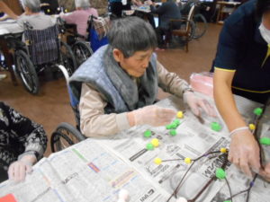 それぞれのテーブルで紙粘土を丸め、枝に刺していきます。