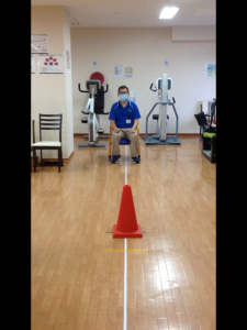 赤いコーンに向かって歩き、コーンを回って椅子に戻ってくるまでの時間を測ります。