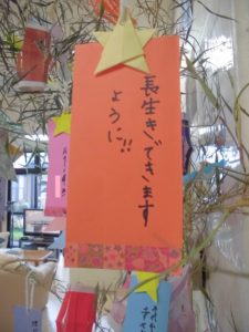 職員とお客様が協力して作った七夕飾りを笹の葉に
