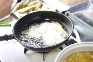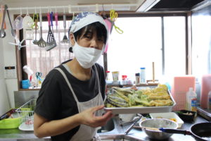 1日目は天ぷら8種、ポテトのオーブン焼き、野菜のおひたしの小鉢、そうめん、お味噌汁。