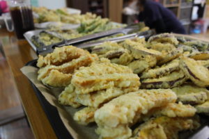 1日目は天ぷら8種、ポテトのオーブン焼き、野菜のおひたしの小鉢、そうめん、お味噌汁。