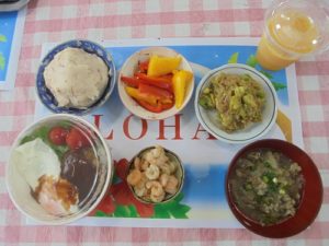 ハワイ料理も味わって頂きたいと思い、昼食会メニューにはロコモコ丼やポキ、ガーリックシュリンプ、
