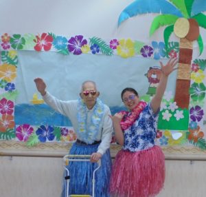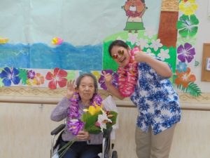現在もコロナの影響と、長引く梅雨でなかなか外出が難しい状況ですが、気分はハワイを旅行しているかのように、晴れ晴れしてほしいとのことでハワイアンイベントを行いました。