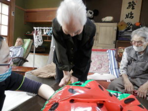 まずは、デモンストレーション用のスイカ風船を一生懸命膨らませていただきました!!