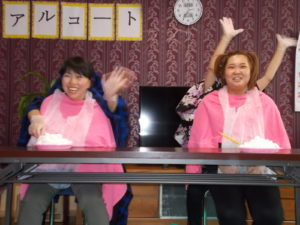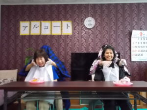 楽しい・面白いことが好きなお客様に喜んでいただけるものは何かを考えまして、今年は職員による2人羽織を行いました。