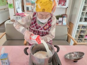 プリンの粉を入れて牛乳を入れて混ぜ混ぜ…