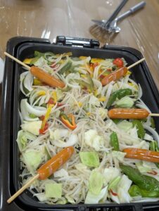 野菜たっぷり入れて焼いていきます!エスポワール畑で収穫したしし唐も役立っています!(^^)!