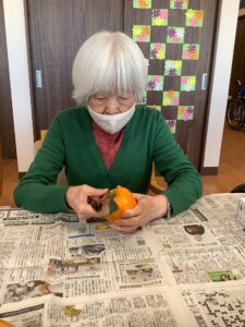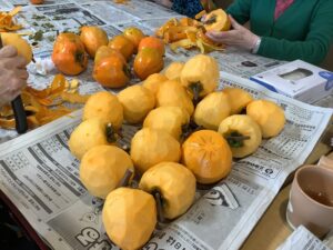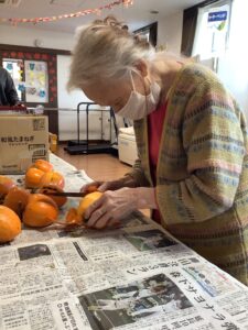干し柿の皮むきです。真剣に頑張ってます。