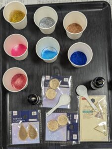 キーホルダー作りではレジン液とカラフルなラメで作ってみました♪